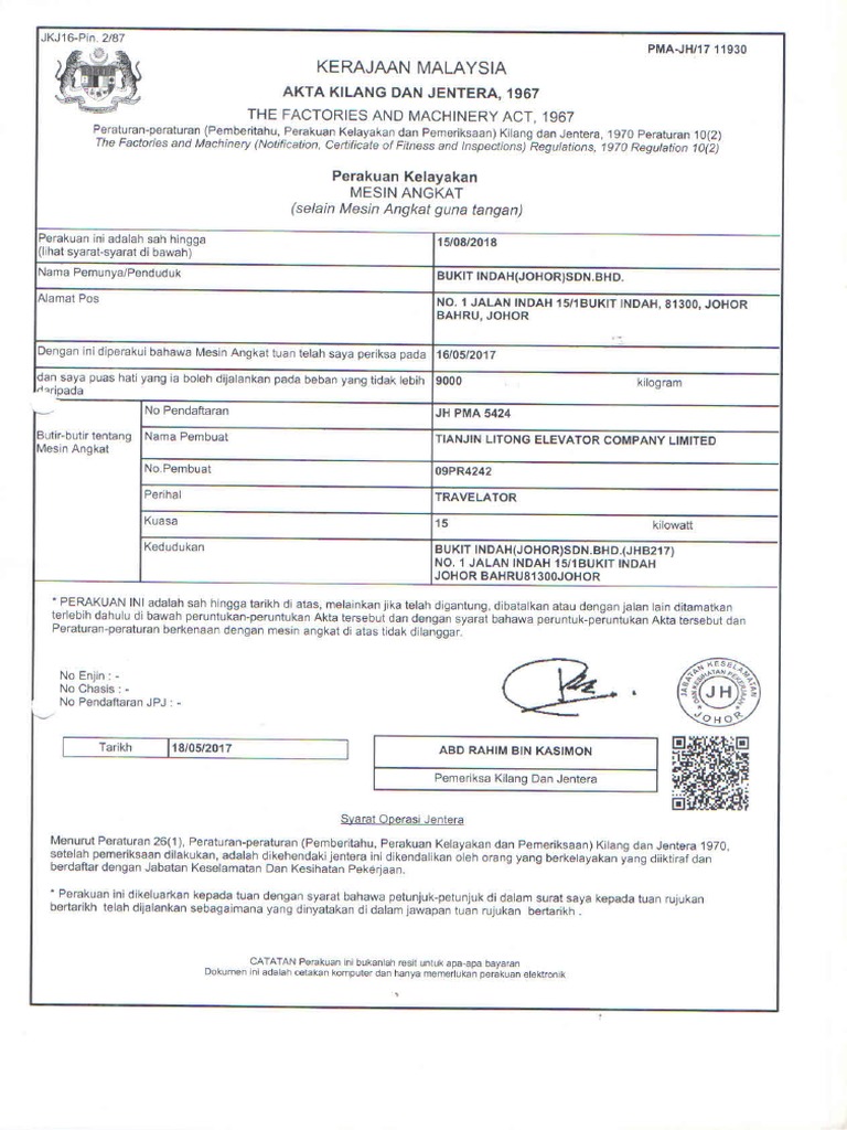 If the inspection is OK then JKKP will issue the PMA Permit Mesin Angkat for the lift. If applicable For example- Certificate of Lifting Machine Qualification Factory and Machinery Act 1967. No 74 Jalan Rodat 20KU5 Bandar Bukit Raja 41050 Klang Selangor Malaysia.